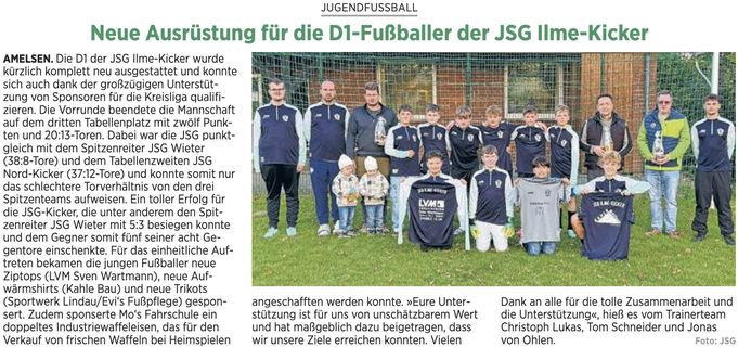 Wir, die JSG Ilme - Kicker D1 möchten uns von Herzen bei unseren Sponsoren bedanken. Eure Unterstützung ist für uns von unschätzbaren Wert und hat maßgeblich dazu beigetragen, dass wir unsere Ziele erreichen konnten. Dank der wiederholten Spende von LVM Sven Wartmann konnten neue Zip Shirts angeschafft werden. Durch die Spende von MO‘s Fahrschule wurde ein doppeltes Industriewaffeleisen für den Verkauf frischer Waffeln angeschafft. Die Spende von Kahle Bau haben wir für neue Aufwärm T-Shirts genutzt. Wir durften uns auch über neue Trikots, dank der Spende von Sport Werk Lindau freuen. Den perfekten Druck hierfür lieferte uns Print for You , was wir durch die Spende von Evi‘s Fußpflege bezahlen konnten. Vielen Dank an alle für die tolle Zusammenarbeit & Unterstützung.